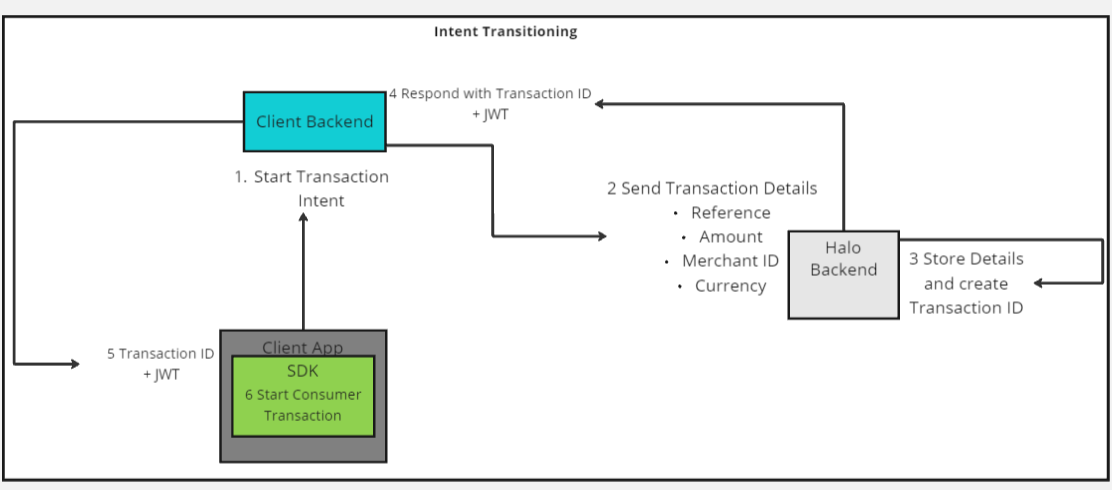 - Customer app creates a request to the customer backend to create an intent transaction through a call to the Halo backend.